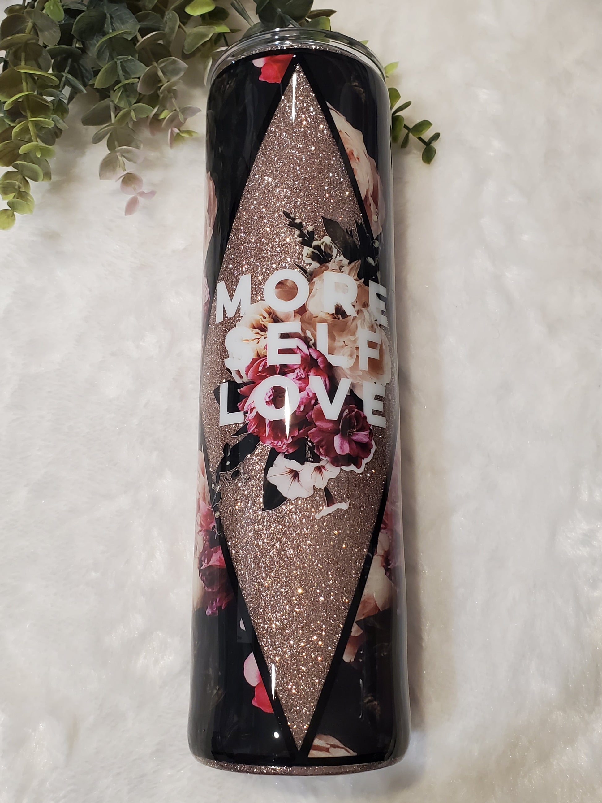 This 32 oz skinny is beautiful with floral vinyl with maroon and peach flowers and stunning matching glitter. The matching floral decal says 'More Self Love" and ties this stunning design together!