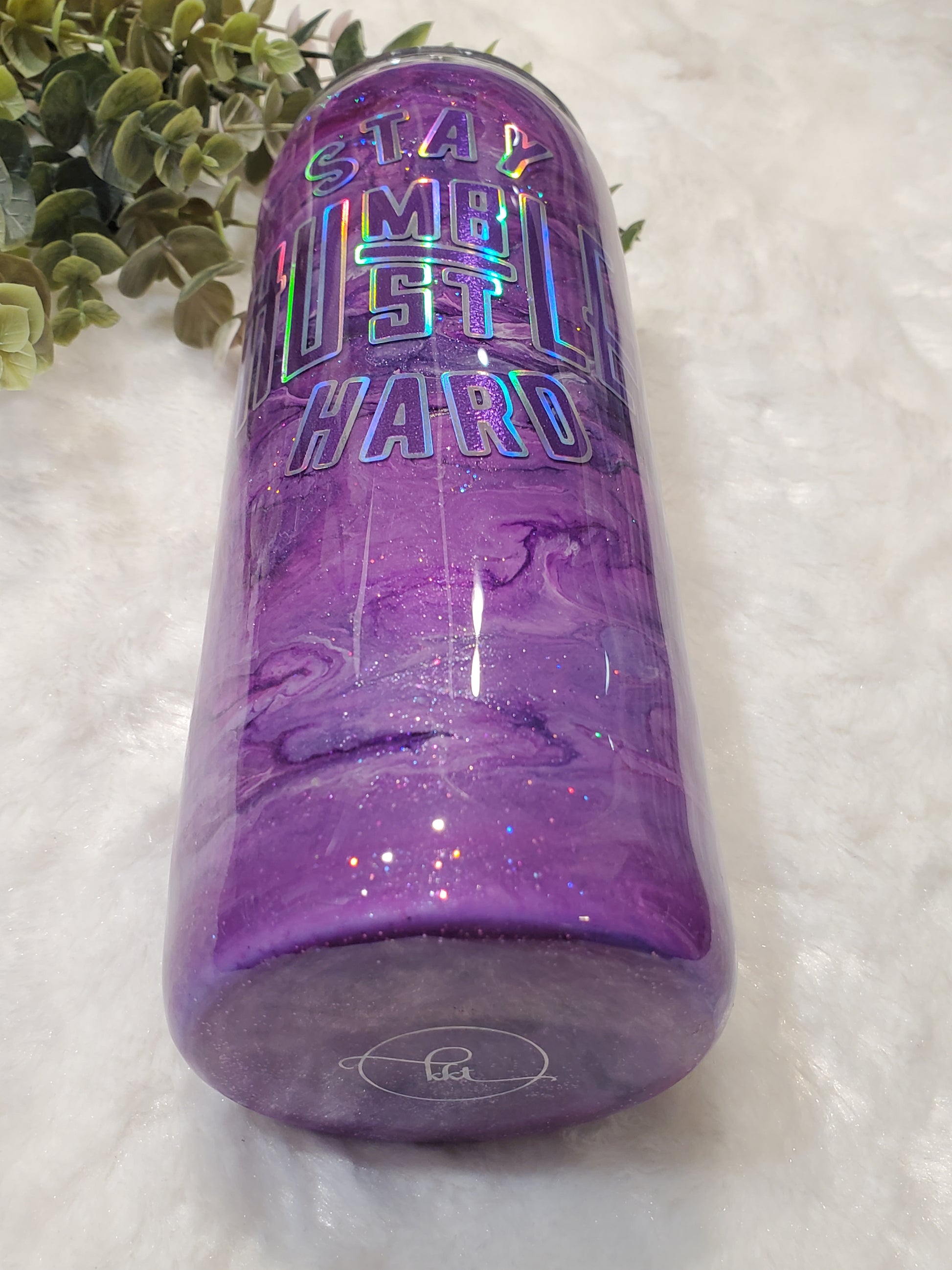 This 20 oz custom tumbler is an ink and pigment swirl with a decal that says "Stay Humble Hustle Hard!" A beautiful name can be added to this; however, please keep in mind that it will take approx. 2 weeks before shipping to allow for a full cure.