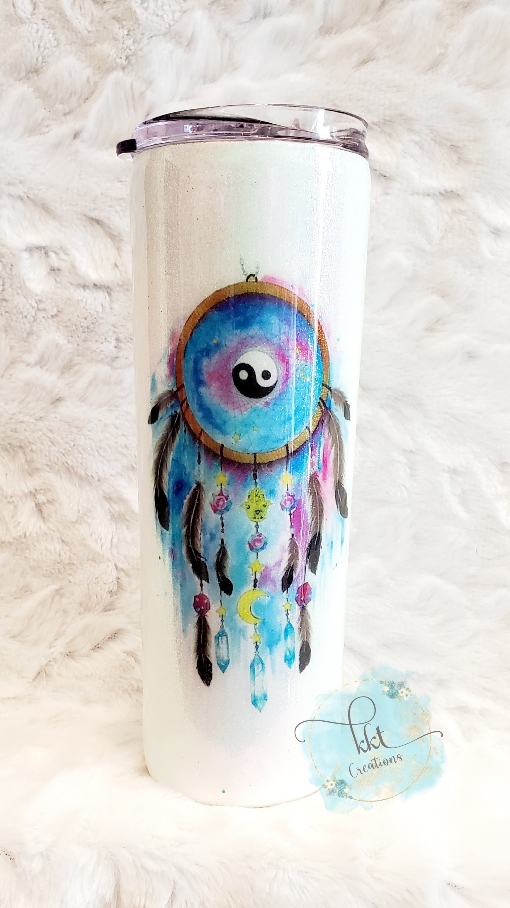 This 20 oz skinny straight is stunning with an opal skinny tack-it method base and a very colorful dreamcatcher decal. A name or decal can be added to this tumbler; however, it will take up to 2 weeks for tumbler to ship.
