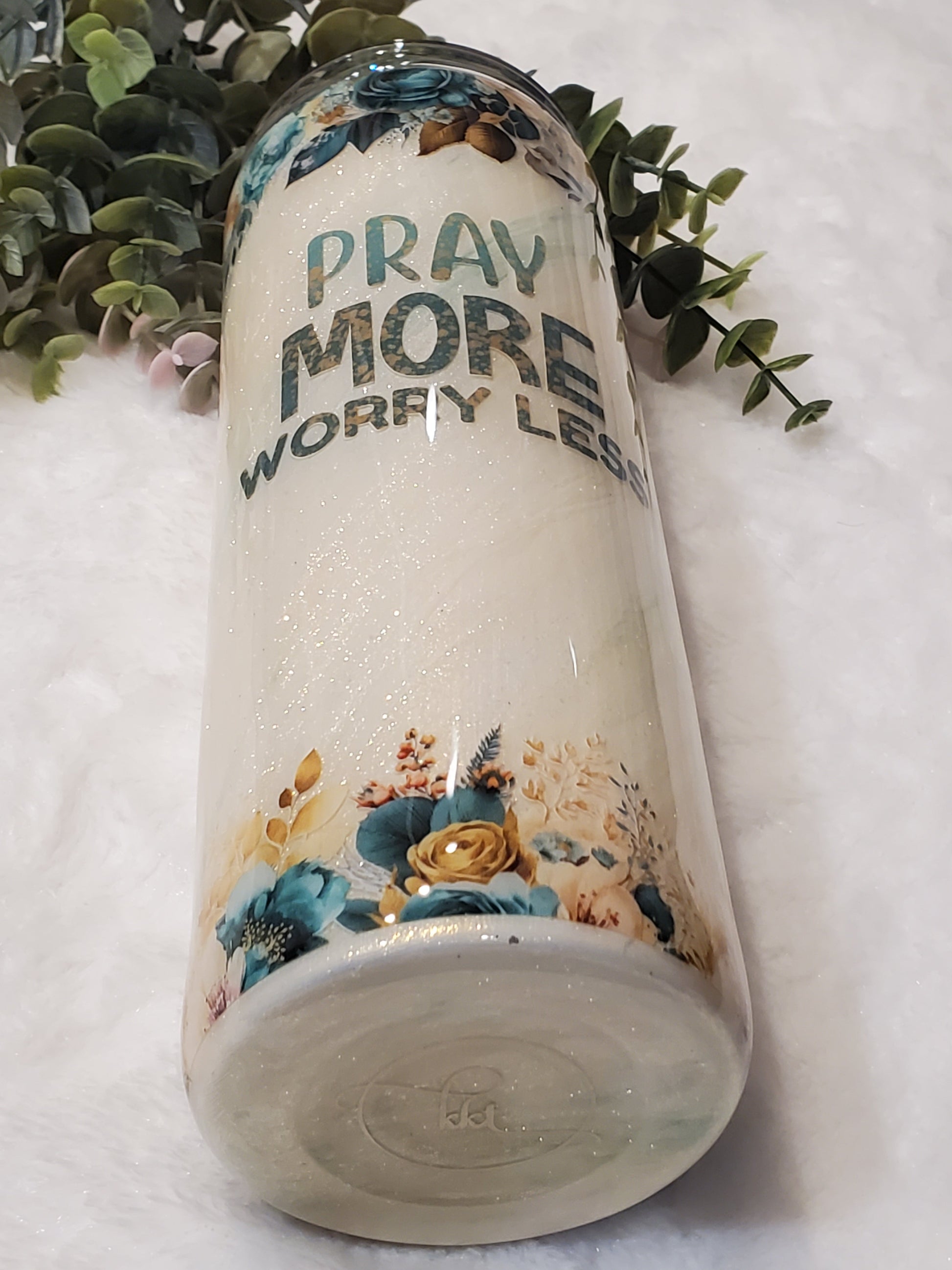 This 20 oz custom tumbler is absolutely gorgeous created with pigments using a swiping or hatching technique. The decal says "Pray More Worry Less" and the flowers around the top and bottom match the decal.