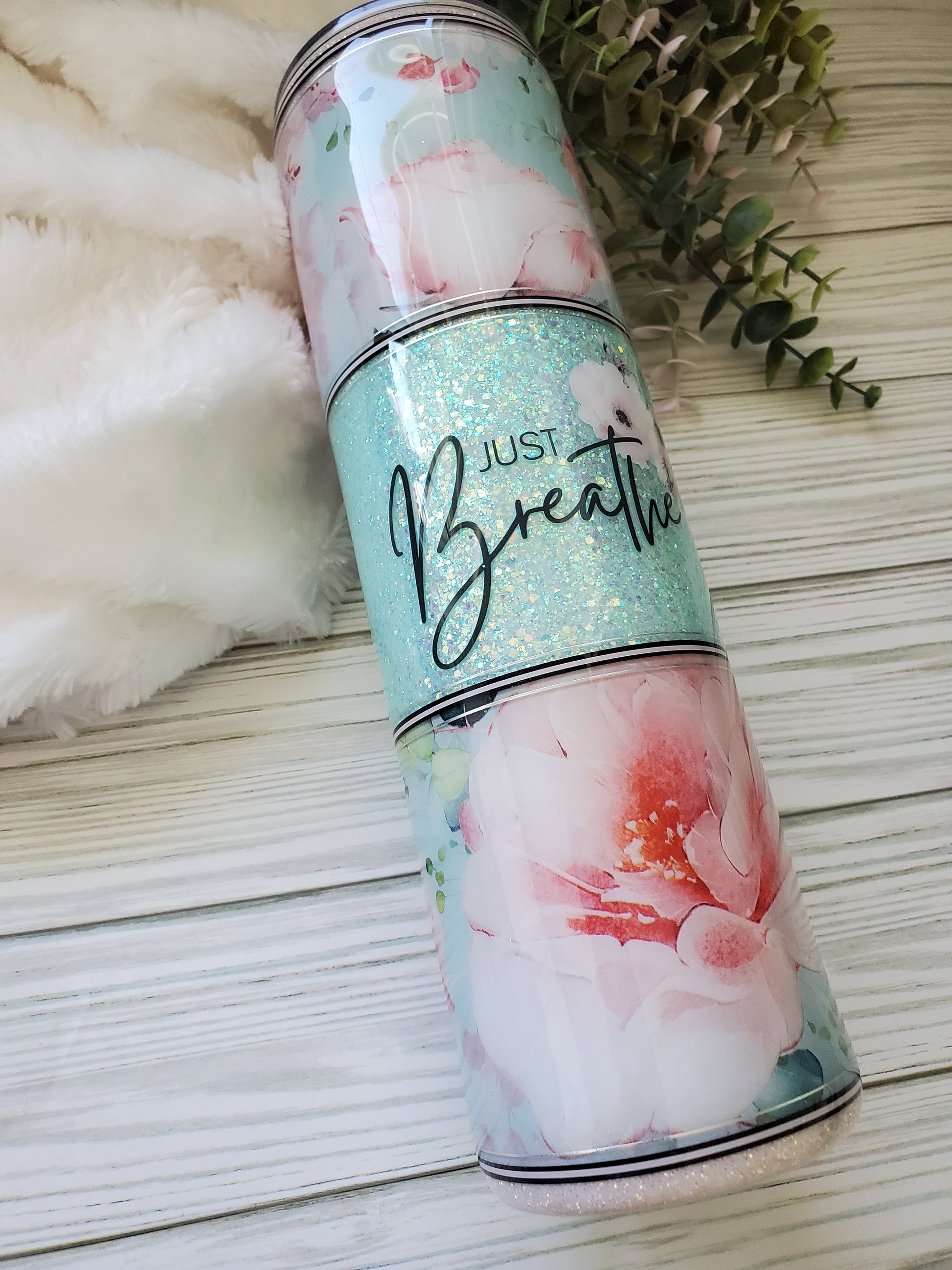 Just Breathe Floral Glitter Custom Tumbler - 32 oz skinny - mint, pink