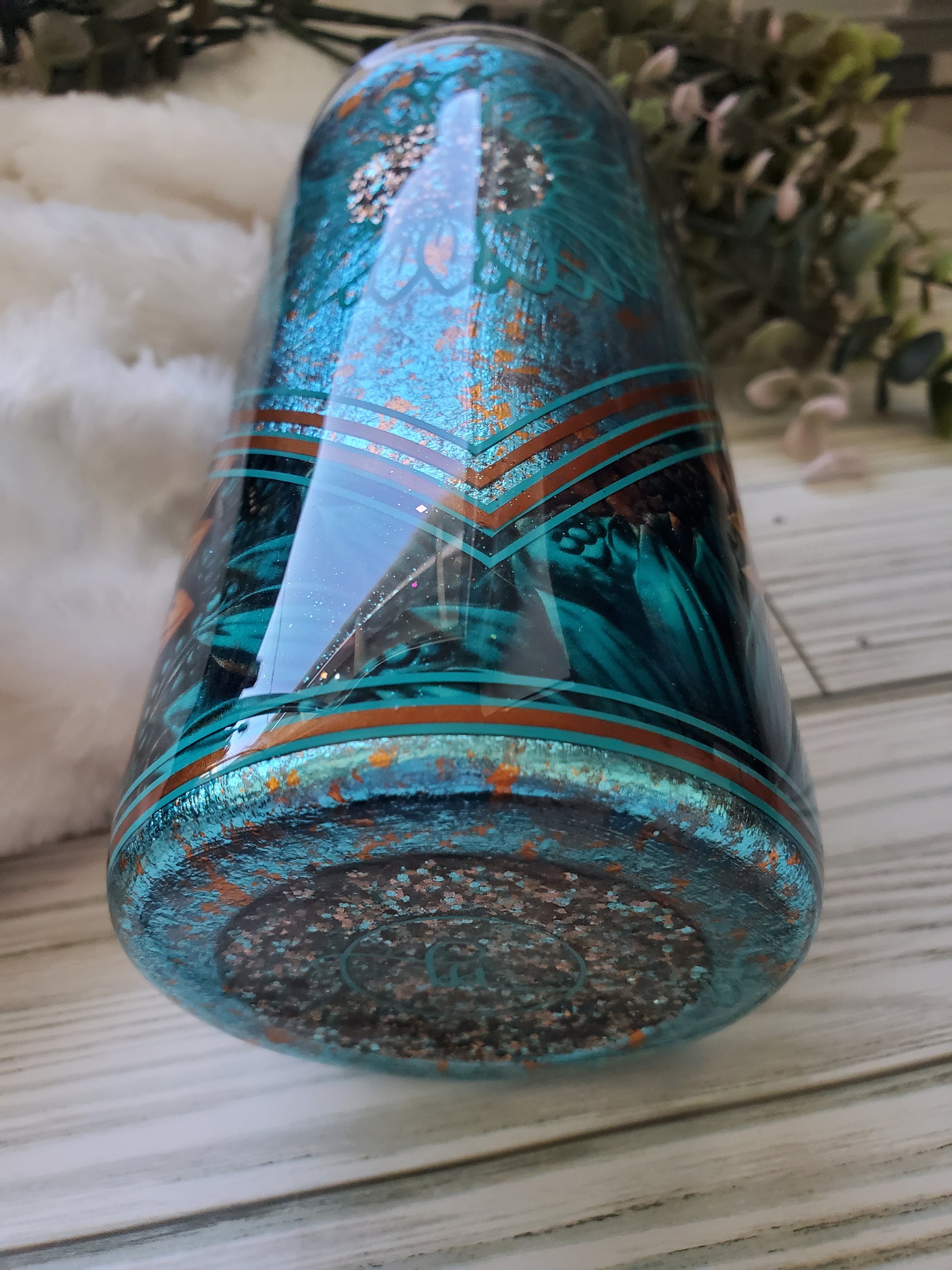 This 15 oz tumbler is so cute! This tumbler has a base of sunflower vinyl in turquoise and browns and a beautiful foil mashup to match. The sunflower decal with glitter ties the whole tumbler together!