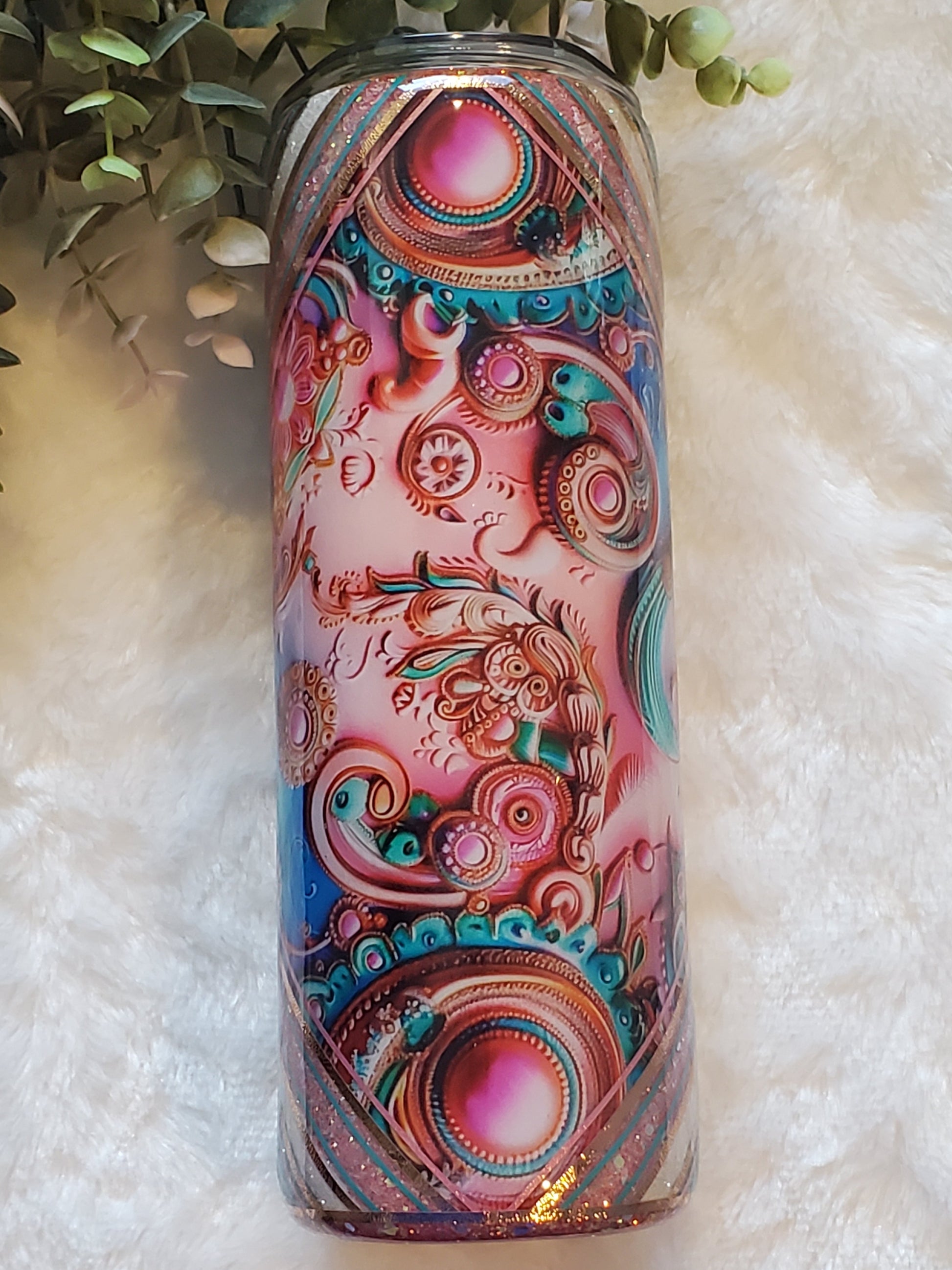 This 20 oz custom tumbler has a beautiful abstract vinyl and is finished with multiple beautiful glitters and striping! This is a beauty!