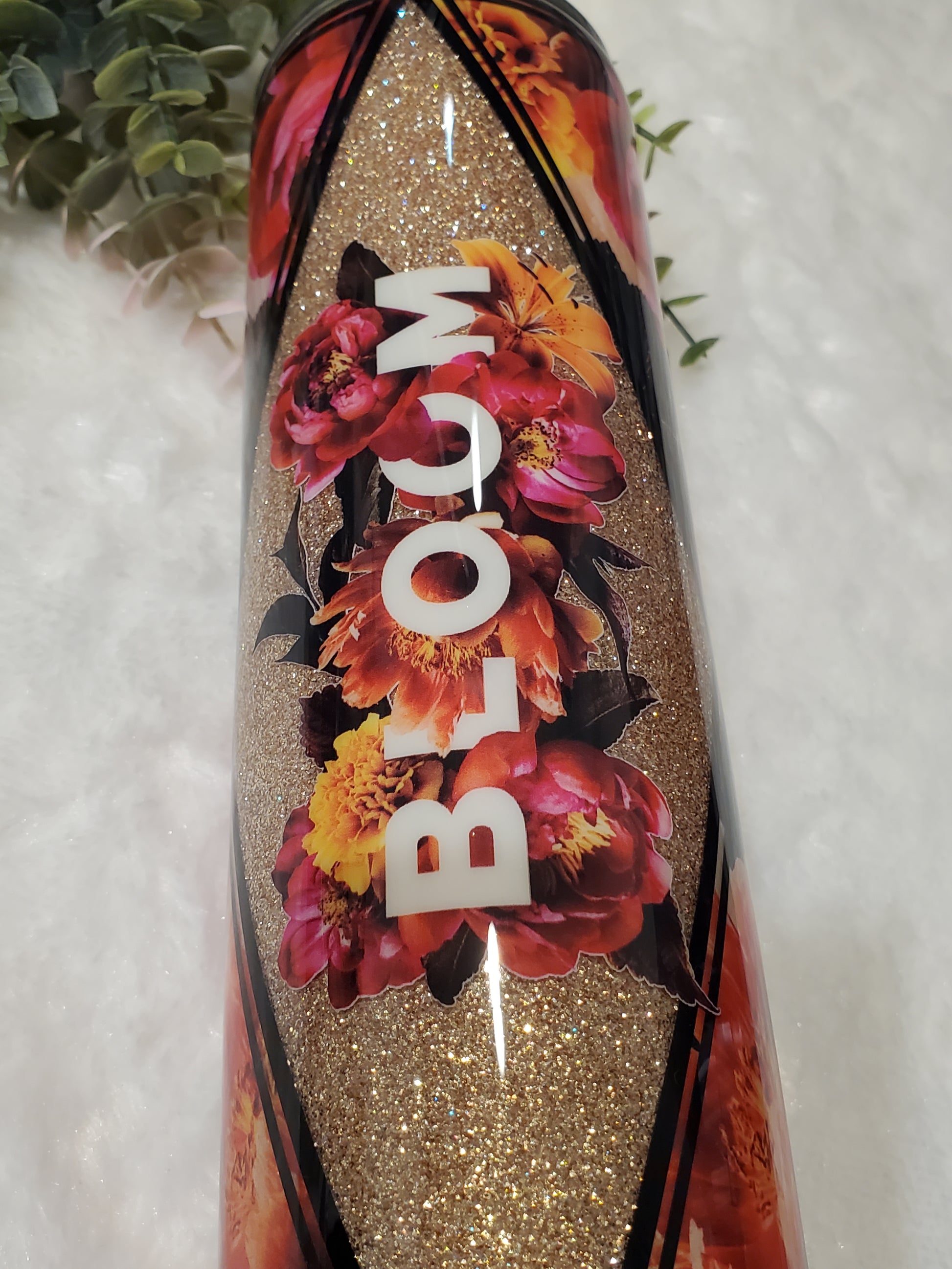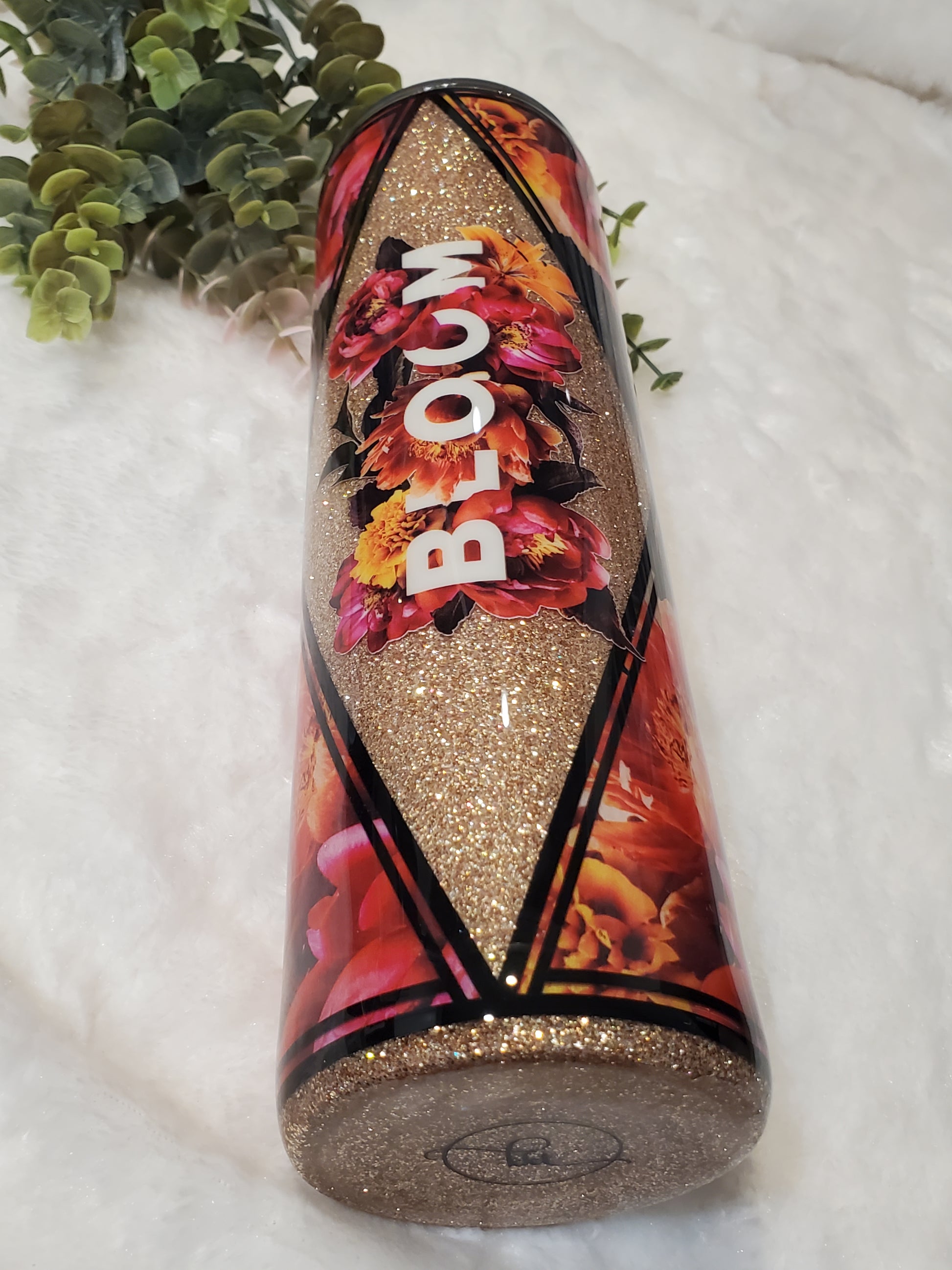 This 32 oz skinny is beautiful with floral vinyl with red, orange and white flowers and champagne gold glitter. The matching floral decal says 'Bloom" and ties this stunning design together!