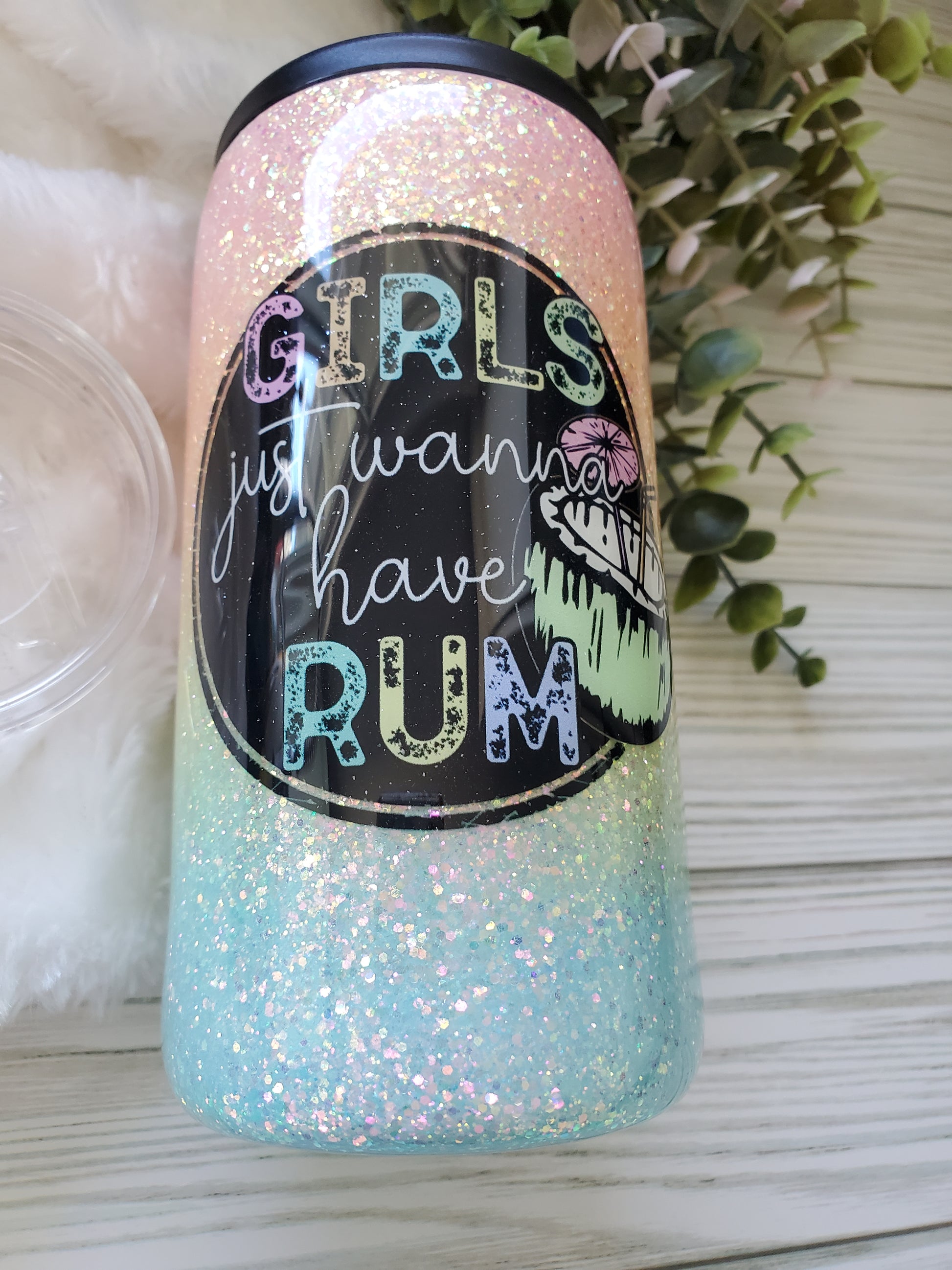 Girls Just Wanna Have Rum Glitter Custom tumbler can cooler - 12 oz SLIM Douzie, can koozie & regular lid included